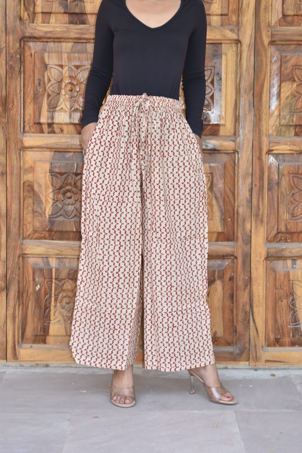 Handcrafted Bagru block-printed palazzo pants in premium Cambric cotton with side pockets, free-size adjustable waist, and breathable comfort—perfect for everyday ethnic elegance.