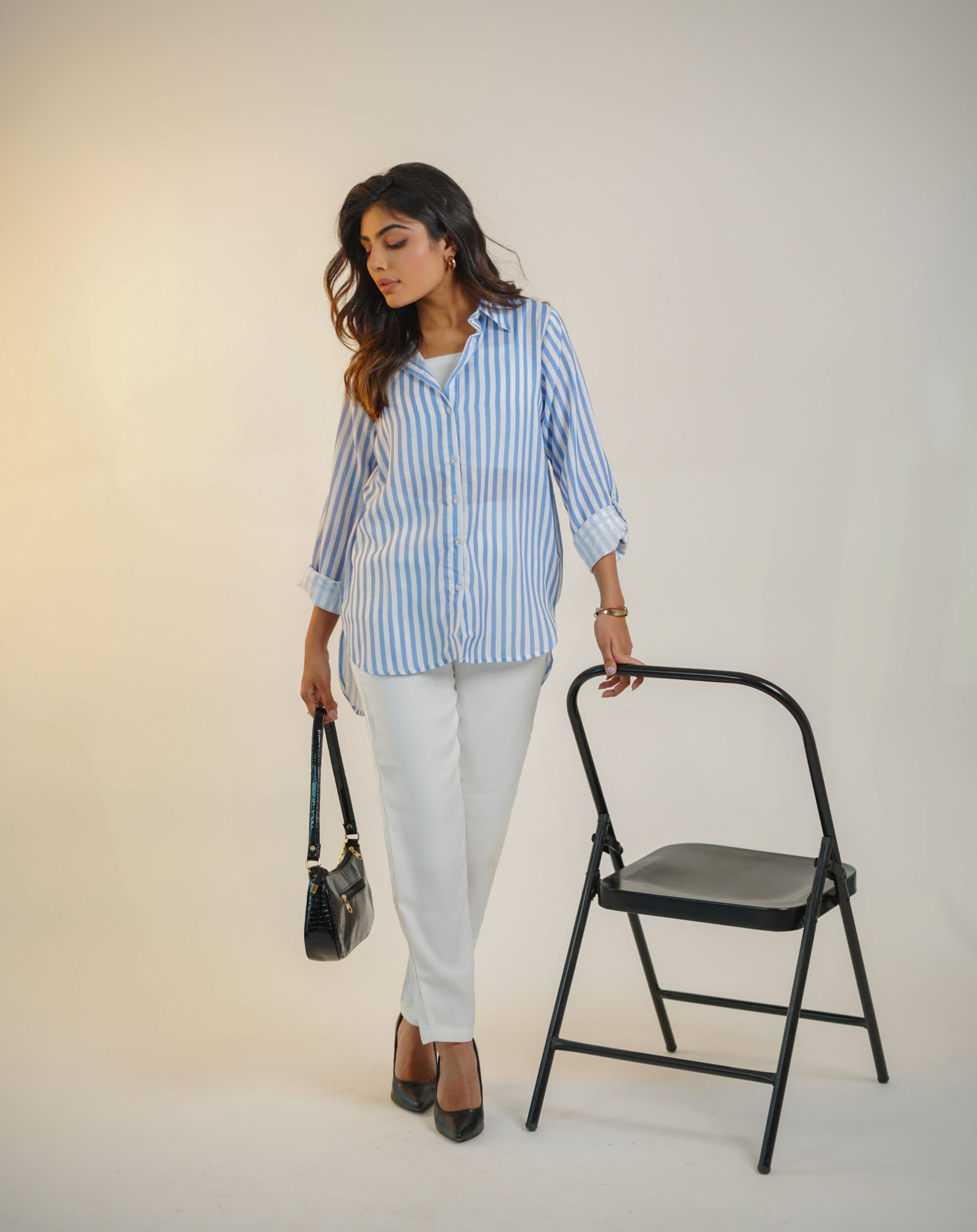 Blue satin stripe shirt—midi-luxe sheen meets relaxed tailoring, ideal for workdays or evenings by KrazyThread.