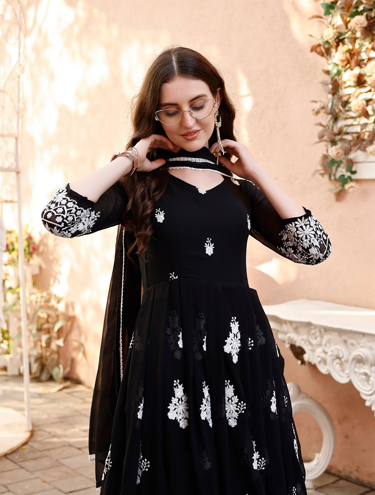 Introducing our “Blackberry” Anarkali gown, a masterpiece of traditional design and contemporary style. This exquisite gown is tailored from premium georgette fabric, celebrated for its fluid drape and lightweight feel, ensuring you look and feel ethereal. The bodice is adorned with intricate embroidery, adding a layer of sophistication and rich texture. Designed with a generous 2.7-meter flair, the gown creates a spectacular, flowing silhouette that moves gracefully with you. It features full-length sleeves and a complete inner lining for maximum comfort and a flawless fit. The ensemble is perfectly complemented by a matching georgette dupatta, finished with a chic lace border on both sides. Ideal for weddings, festive gatherings, or formal events, the “Blackberry” gown is a symbol of refined grace.