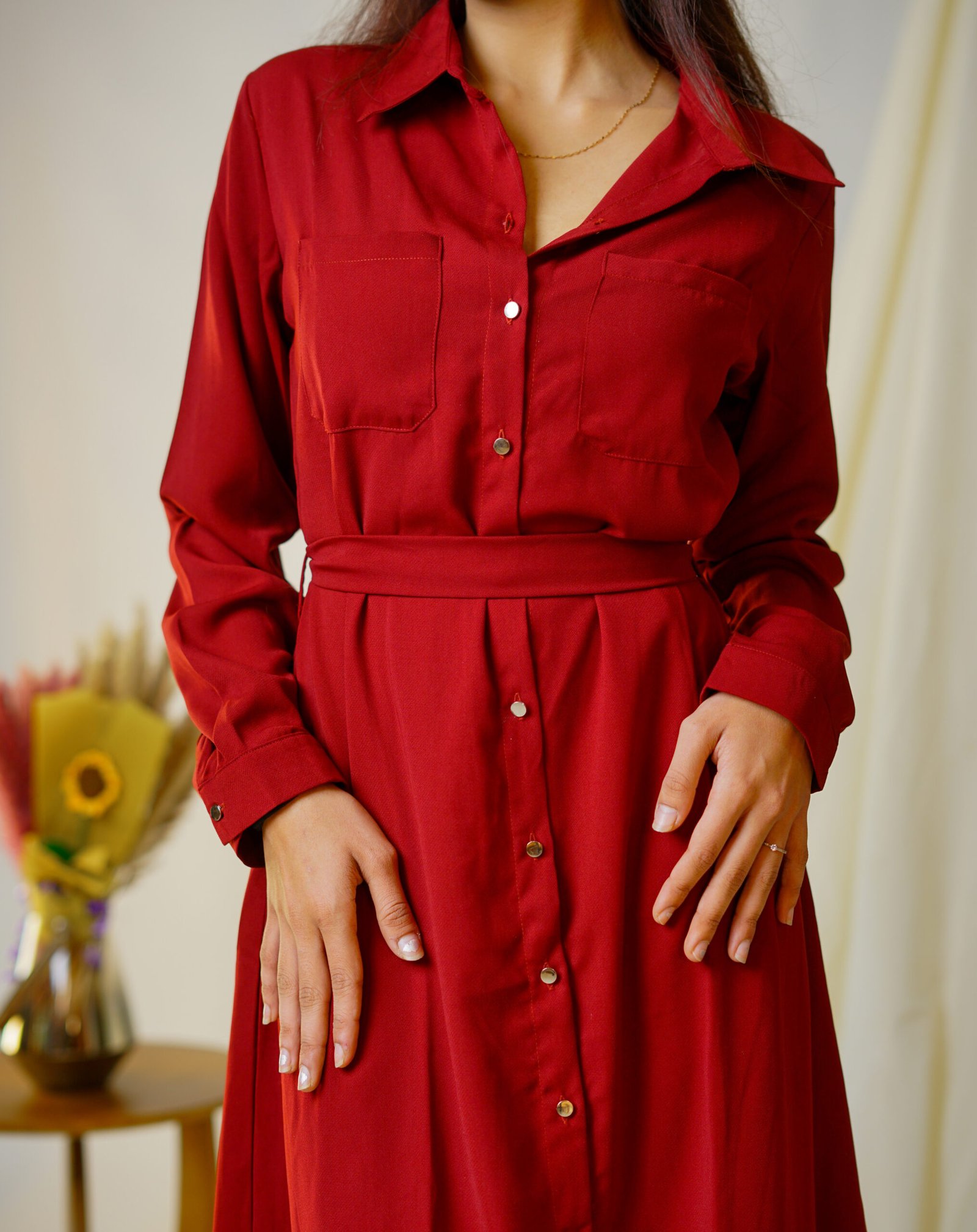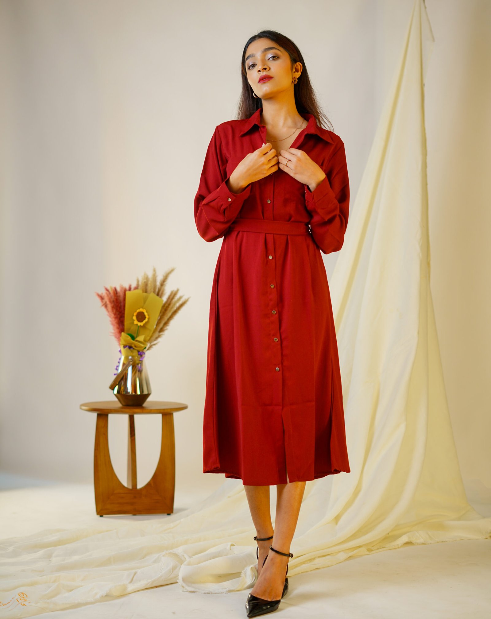 Embrace graceful sophistication with the Burgundy Belle Cuffed-Sleeves Midi Dress from KrazyThread. This stylish shirt-dress is crafted in a luxe maroon shade from lightweight satin-feel polyester (~120 GSM). It features a classic shirt collar, smart cuffed 3/4 sleeves, and a button-down front. The dress includes a subtly gathered waist and optional belt to define your silhouette, alongside side slits that add both comfort and effortless movement. Perfect for day-to-night elegance, from office hours to social evenings.