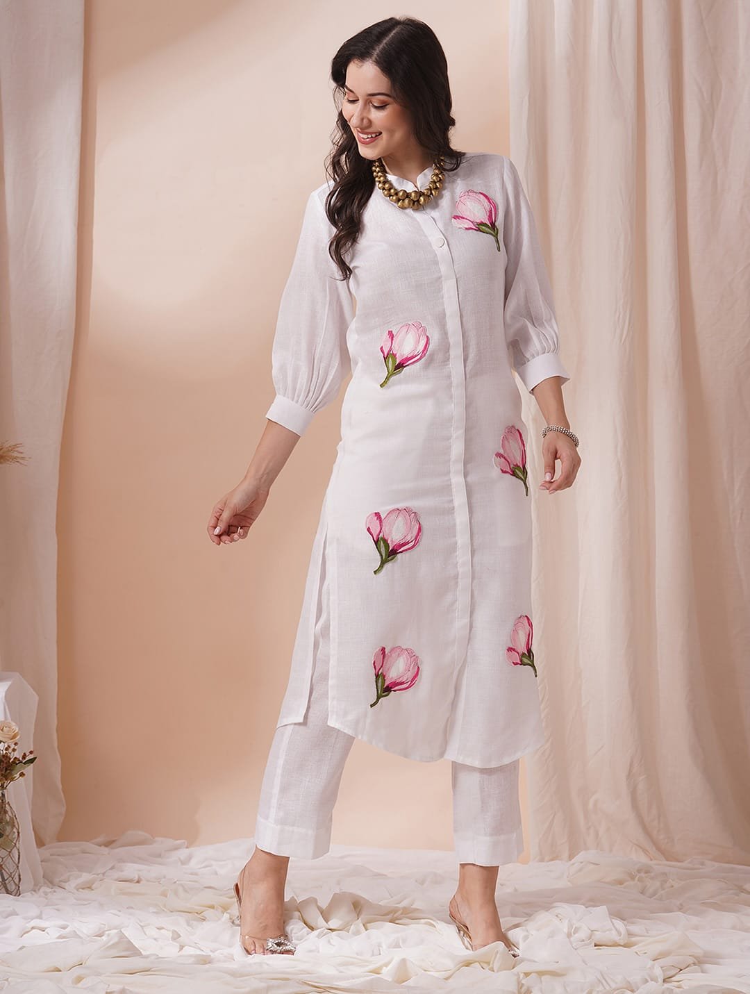 Charming Floral Print:Â The pristine white cotton fabric is adorned with a delicate floral print, adding a touch of femininity and charm to the overall design.