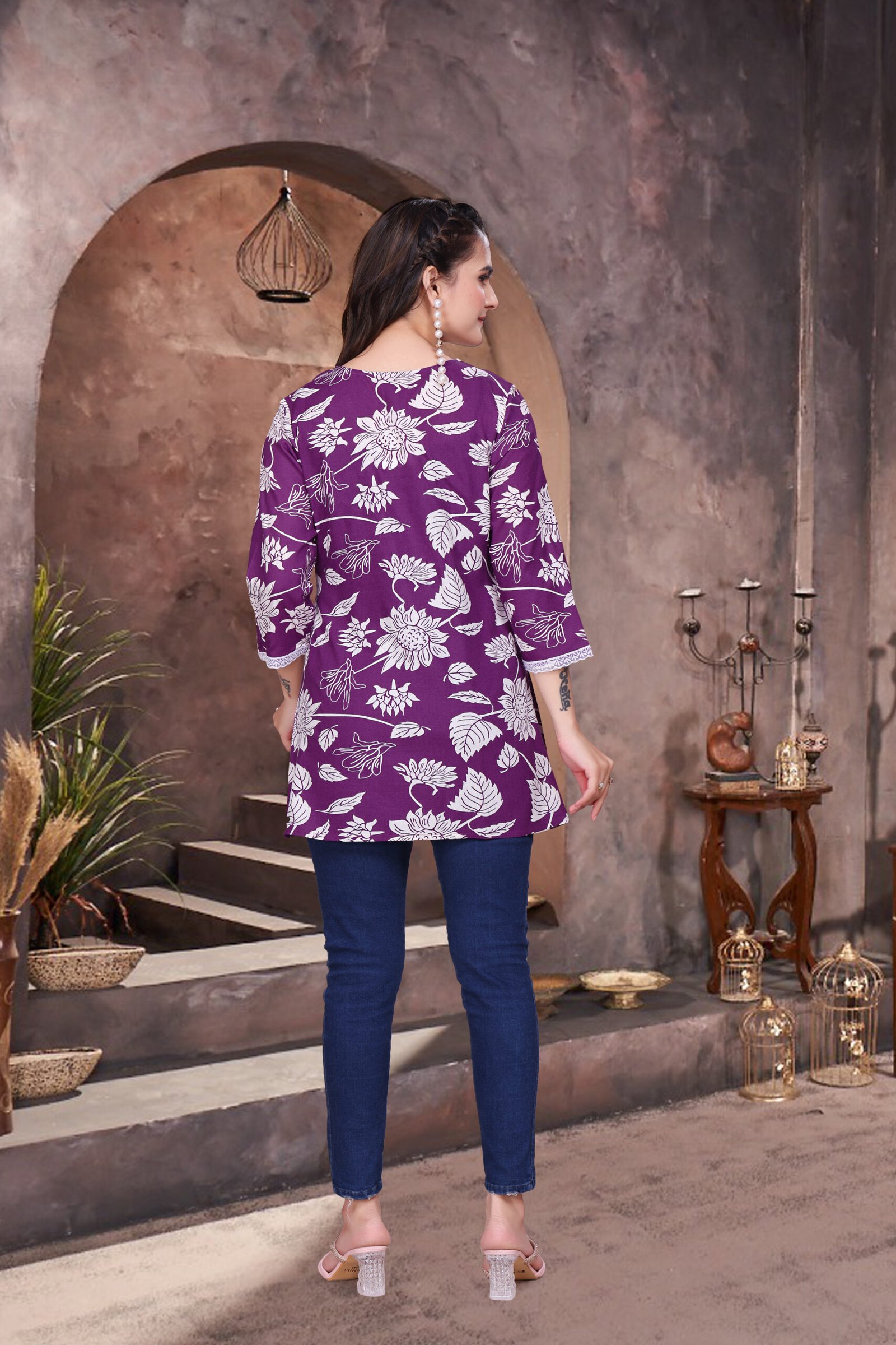 Crafted from premium rayon fabric, this top offers a soft and breathable feel, ensuring comfort throughout the day. The highlight is the exquisite Schiffli lace work, adding a touch of sophistication and femininity to the design. With a length of 32 inches, it pairs seamlessly with jeans, trousers, or skirts, making it a versatile addition to your wardrobe.